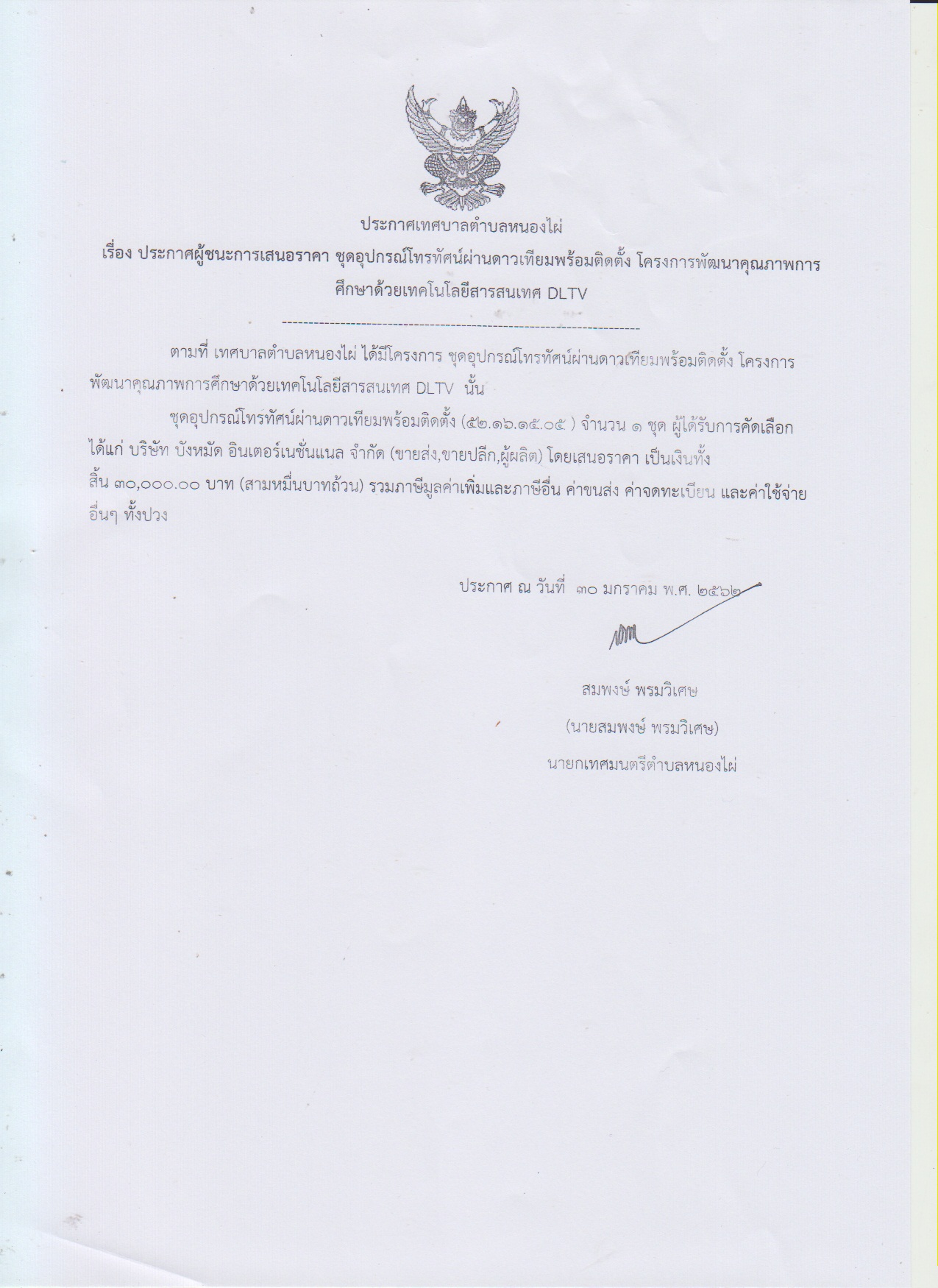 ประกาศผู้ชนะการเสนอราคา ชุดอุปกรณ์โทรทัศน์ผ่านดาวเทียมพร้อมติดตั้ง โครงการพัฒนาคุณภาพการศึกษาด้วยเทคโนโลยีสารสนเทศ